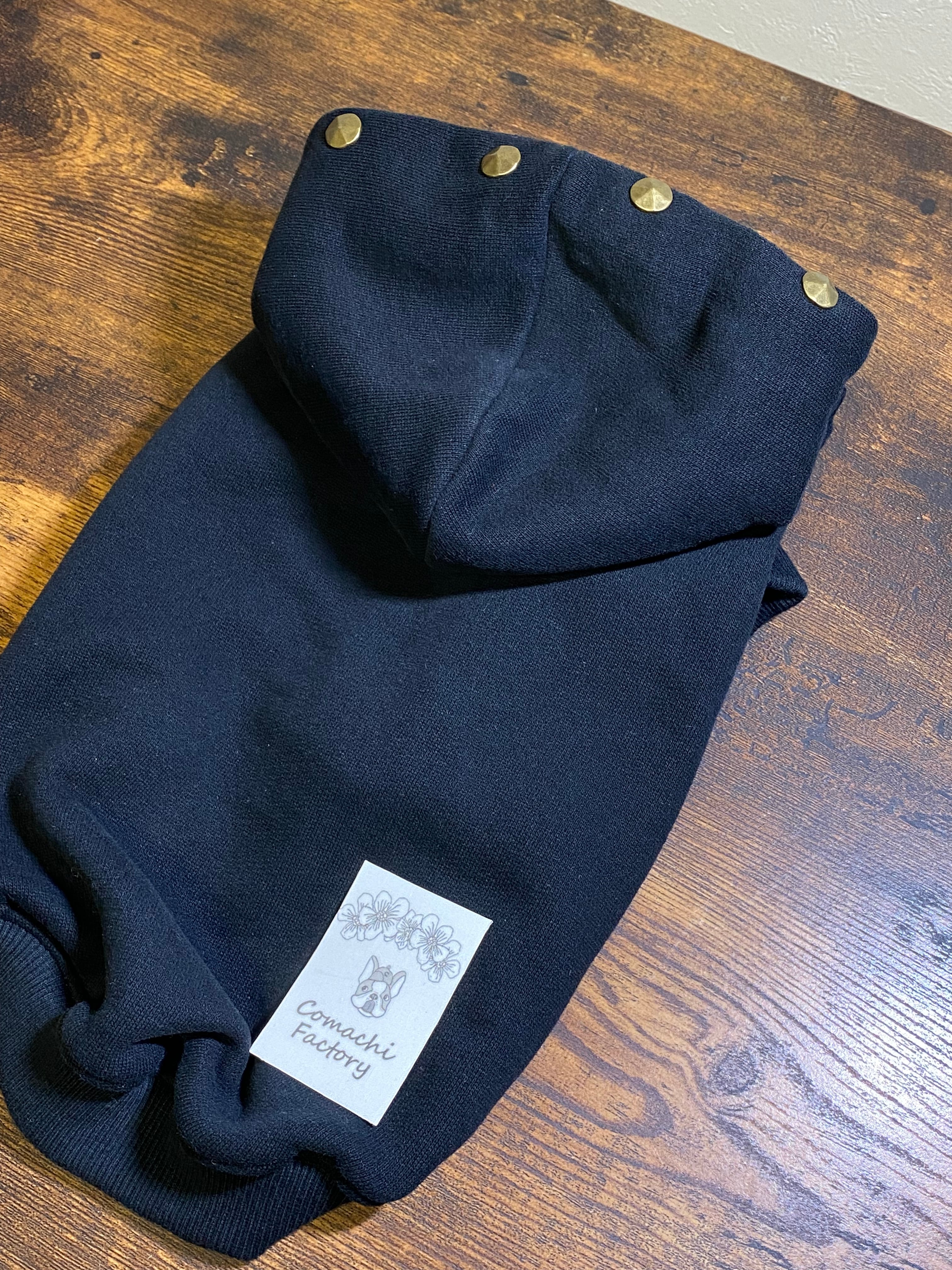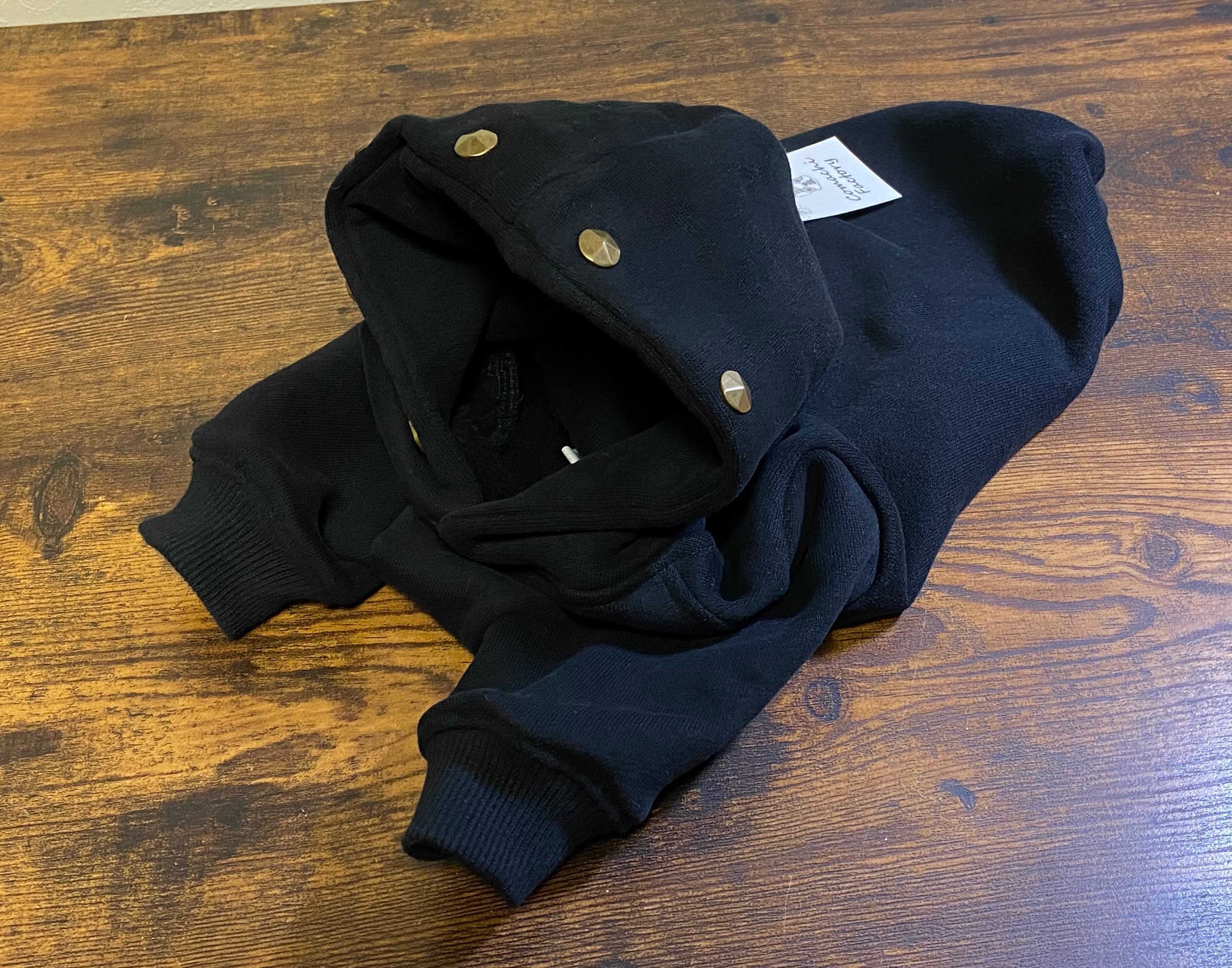 フード周りにスタッズの付いた裏起毛のパーカー。