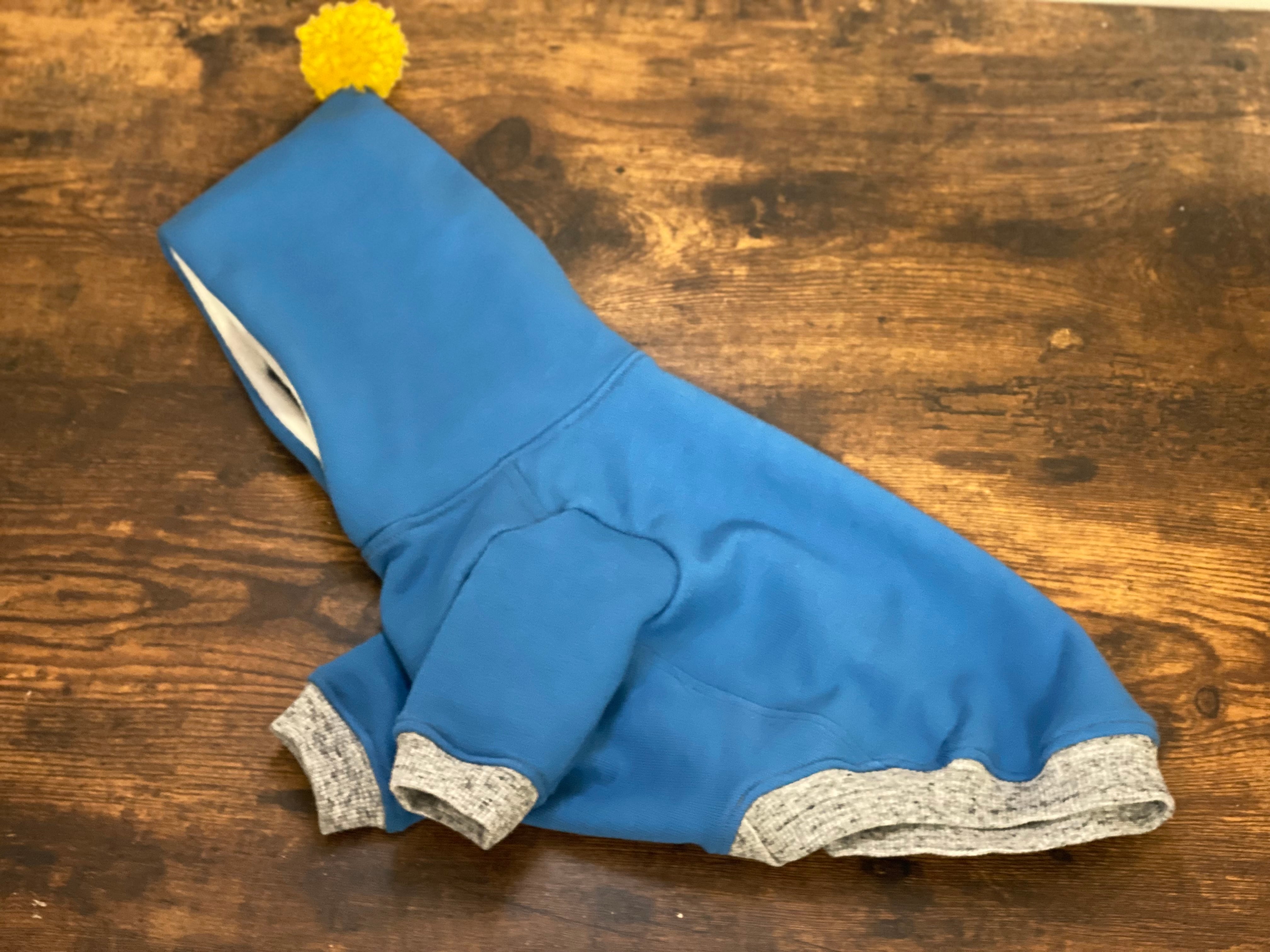 ブルーのトンガリフードパーカー。フード裏はネイティブ柄のふんわりフリースになってます。イエローのポンポンがワンポイントになってます♡